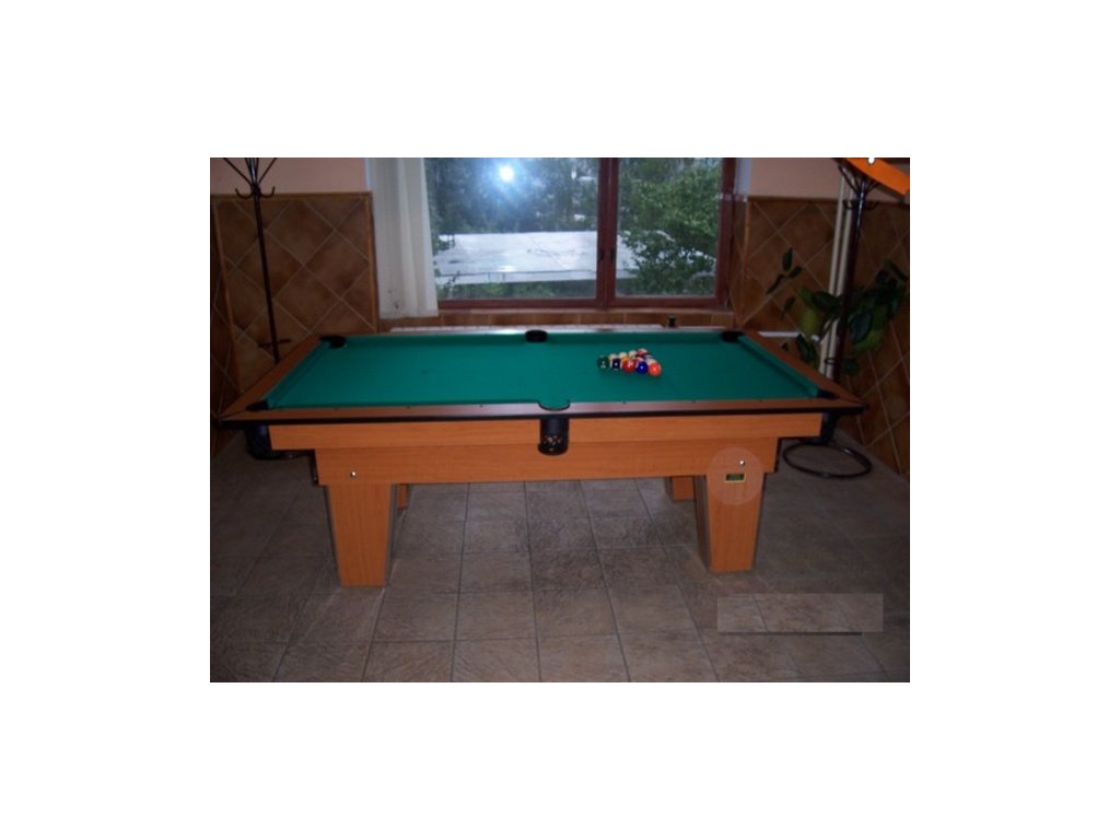 - celkový rozměr stolu 130 x 230 cm, potaženo suknem Europool zelené barvy (popř. modré, červené), váha cca 120 kg